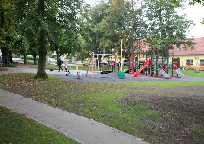 Má nově vybavené klidné místečko s posezením na vodňanských lavičkách pro maminky s malými dětmi (s novým pítkem s pitnou vodou), obnoveného mamuta z Marsu a nové hrací prvky s bezpečnými dopadovými plochami pro větší děti, plácek na streetball i pár workoutových cvičebních prvků pro starší i dospělé.